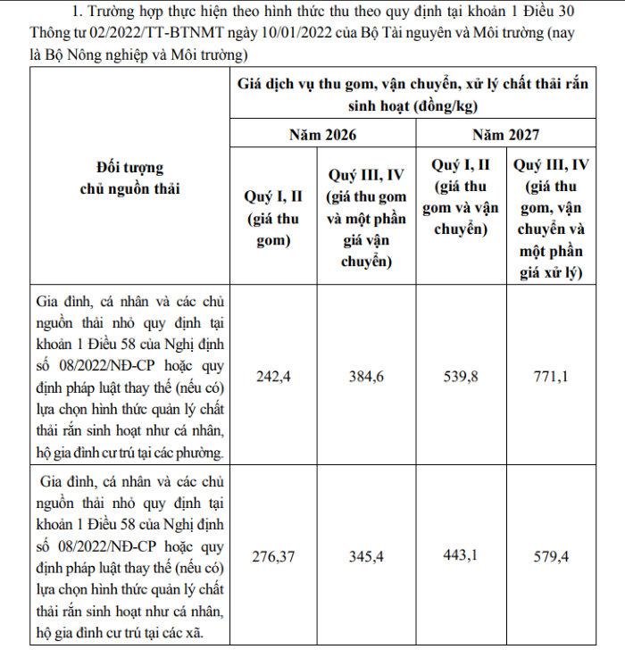 Đối với hộ gia đình, cá nhân cư trú tại khu vực xã, đơn giá dịch vụ tương ứng là 276,37 đồng/kg trong quý I, II/2026 và tăng lên 345,4 đồng/kg trong quý II, IV/2026.