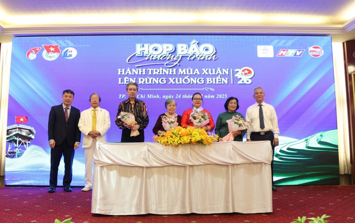 Sáng 24/12, Quỹ Học bổng Vừ A Dính, CLB “Vì Hoàng Sa - Trường Sa thân yêu” phối hợp với Đài Phát thanh và Truyền hình TP Hồ Chí Minh tổ chức buổi họp báo giới thiệu Chương trình giao lưu nghệ thuật với chủ đề “Hành trình mùa xuân lên rừng xuống biển" năm 2026 nhằm thể hiện sự đền ơn đáp nghĩa đối với những người ngày đêm canh giữ biên giới, hải đảo.
